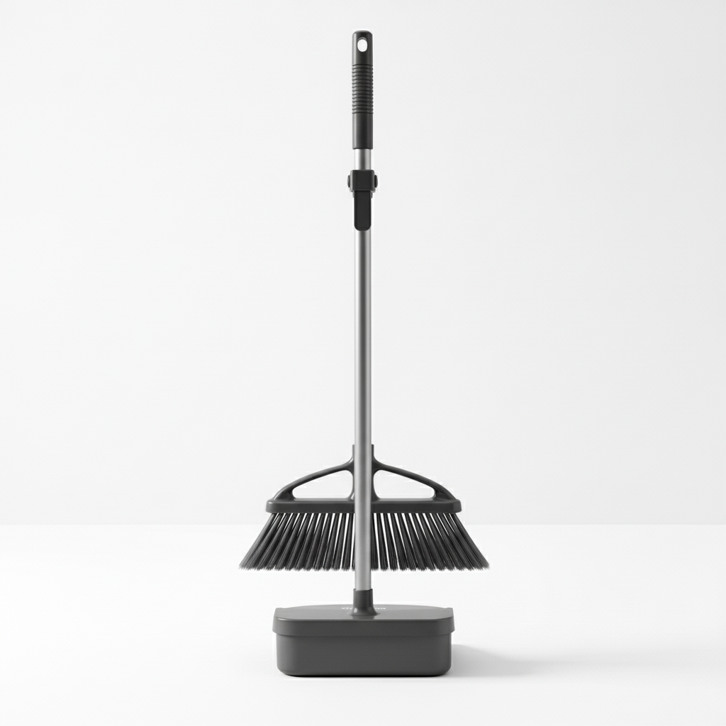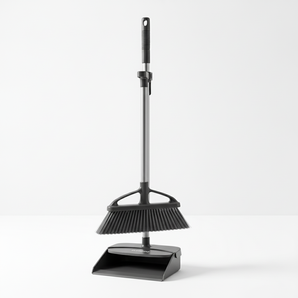 Constructed with a sturdy stainless steel handle, high-density PET bristles for superior sweeping, and a durable ABS plastic dustpan with a flexible rubber lip.